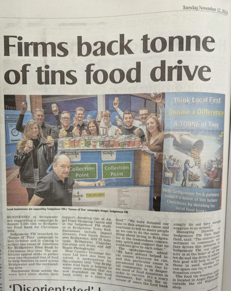 The goal of collecting 2,500 tins might seem ambitious, but with the determination of Sedgemoor FM and the backing of our incredible community, we’re confident it can be achieved—and exceeded! At West Country Drainage Services, we’re proud to be part of this campaign and encourage everyone to get involved by donating where possible.